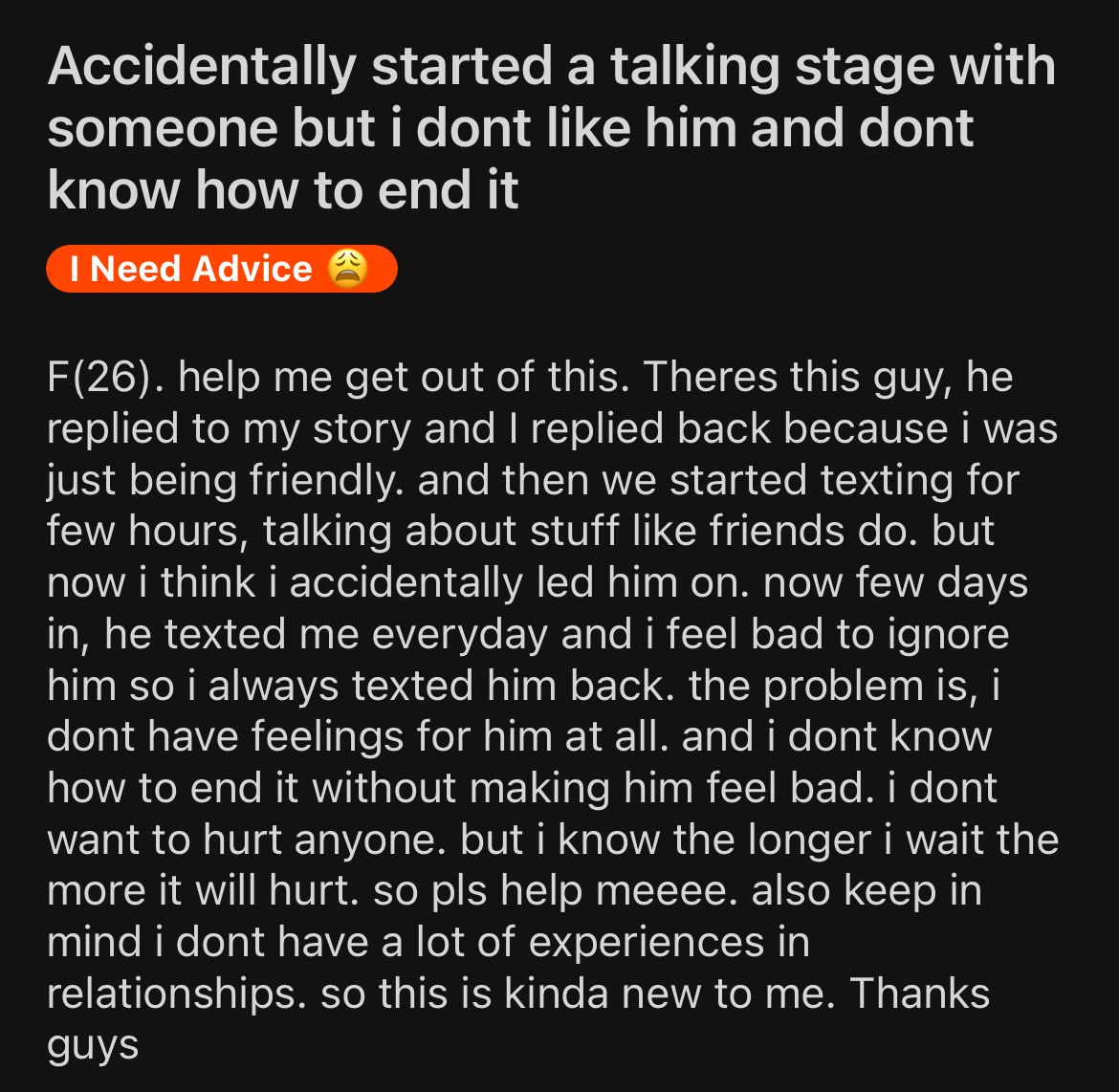 I mean, really, just think it through. You don't like the guy, you don't wanna lead him on, and you know that the longer you wait the more it'll hurt the guy down the road.